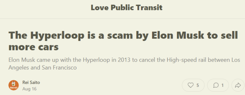 As it turns out, he was never planning to build the train. Instead, he used his feigned interest to derail (excuse the pun) the very real plans to build a high-speed train system between San Francisco and LA. Why would he do that? Because a high-speed train would interfere with sales of Teslas, of course.