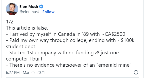 It’s hard to take seriously any of Musk’s claims about his history, as it’s been proven repeatedly that he has lied about his credentials and other important biographical facts. This part of the story is beautifully laid out in the Capitol Hunters thread. He’s told various stories about his college degrees, saying that he earned degrees from UPenn in Physics (false) and Computational Physics (this degree doesn’t exist).